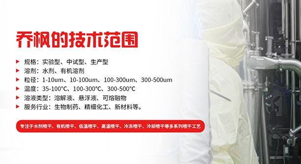 上海喬楓實業有限公司,成立于2012年,是從事噴霧干燥設備的研發設計、生產、銷售(小型噴霧干燥機實驗型噴霧干燥機,35℃低溫噴霧干燥機有機溶劑噴霧干燥機,低溫閉式循環噴霧干燥機、超細粉末噴霧干燥機噴霧冷凍干燥機、真空噴霧干燥機、氣流噴霧干燥機噴霧造粒干燥機離心噴霧干燥機,沸騰制粒機等)和售后于一體的綜合性公司,本公司現成為一家致力于為生物制藥、精細化工、新能源、陶瓷造粒及食品工程等領域提供全套解決方案的整線交鑰匙工程企業。